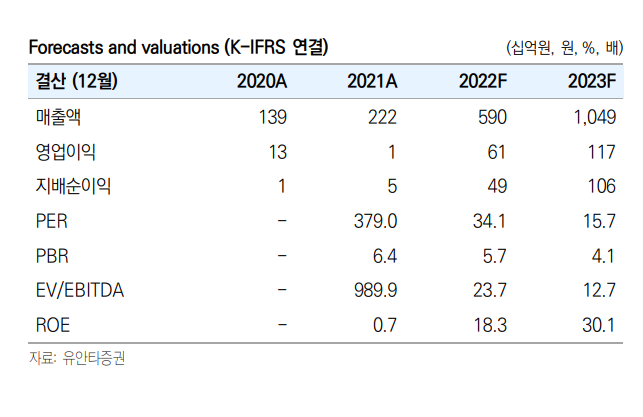 - 어느 정도의 실적 개선이냐? 아래는 유안타증권 김광진 애널의 보고서에서 따온 밸류에이션 표이다. 지금 1분기 실적으로는 매출총이익단에서부터 손실을 기록중이라 PSR 혹은 DCF 방식 외에는 가치평가도 불가하다. 결론은 지금도 굉장히 비싸다. 합리화 되는 멀티플은 아니라고 생각한다. 아마 예상치를 하회하는 실적들과 점점 꺽이는 투심, 보호예수 물량의 출현으로 계속 어려운 상황이 이어질 것으로 보여진다. 시장이 예상하는 그리고 좋게 보는 실적은 아래 추정치 정도이다. 매출액 5천억, 영업이익/당기순이익 실현.